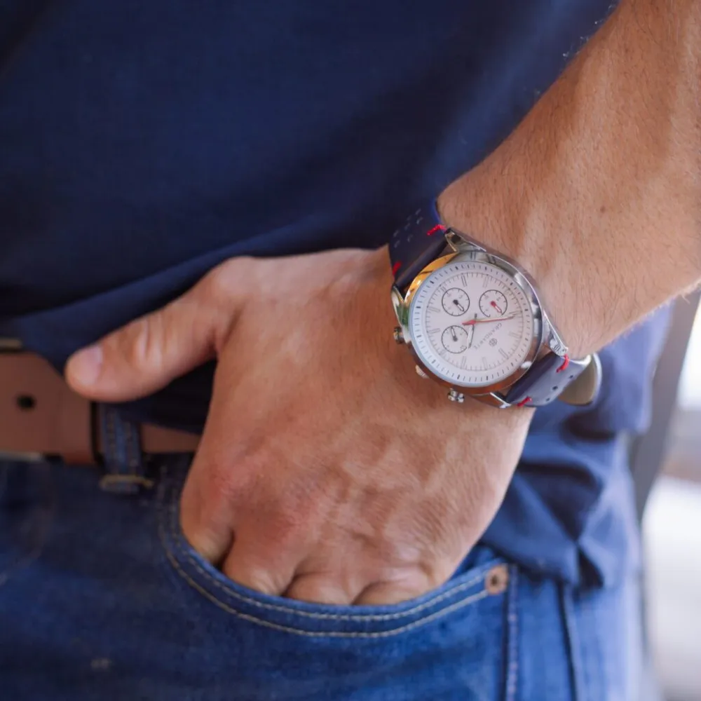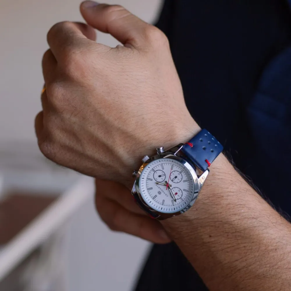 Relógio minimalista Grandarte com pulseira em couro Sintético azul, caixa em metal prata e mostrador não funcional branco 40mm.
